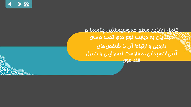 پاورپوینت کامل ارزیابی سطح هموسیستئین پلاسما در مبتلایان به دیابت نوع دوم تحت درمان دارویی و ارتباط آن با شاخصهای آنتیاکسیدانی، مقاومت انسولینی و کنترل قند خون