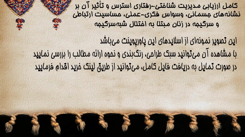 پاورپوینت کامل ارزیابی مدیریت شناختی-رفتاری استرس و تأثیر آن بر نشانههای جسمانی، وسواس فکری-عملی، حساسیت ارتباطی و سرگیجه در زنان مبتلا به اختلال شبهسرگیجه