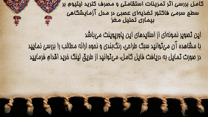 پاورپوینت کامل بررسی اثر تمرینات استقامتی و مصرف کلرید لیتیوم بر سطح سرمی فاکتور تغذیهای عصبی در مدل آزمایشگاهی بیماری تحلیل مغز