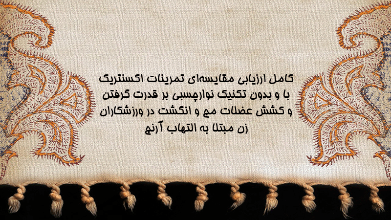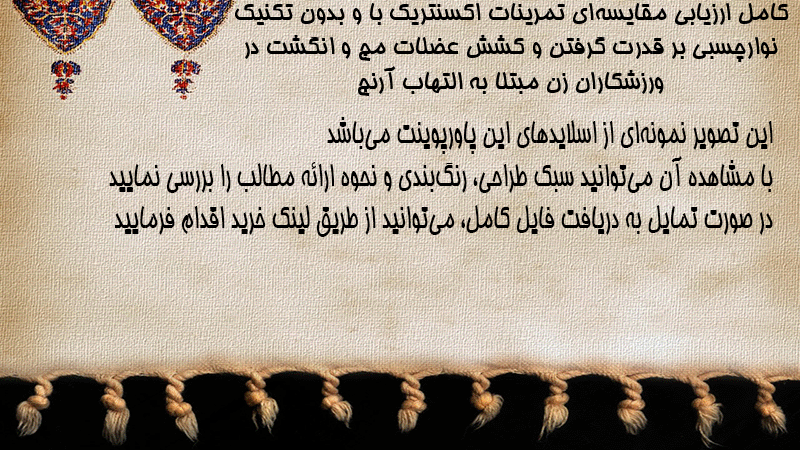 پاورپوینت کامل ارزیابی مقایسهای تمرینات اکسنتریک با و بدون تکنیک نوارچسبی بر قدرت گرفتن و کشش عضلات مچ و انگشت در ورزشکاران زن مبتلا به التهاب آرنج