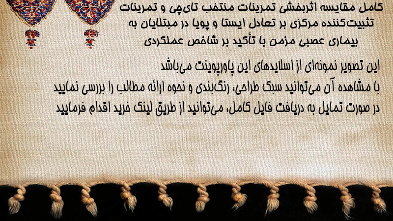 پاورپوینت کامل مقایسه اثربخشی تمرینات منتخب تایچی و تمرینات تثبیتکننده مرکزی بر تعادل ایستا و پویا در مبتلایان به بیماری عصبی مزمن با تأکید بر شاخص عملکردی