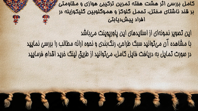 پاورپوینت کامل بررسی اثر هشت هفته تمرین ترکیبی هوازی و مقاومتی بر قند ناشتای مختل، تحمل گلوکز و هموگلوبین گلیکوزیله در افراد پیشدیابتی