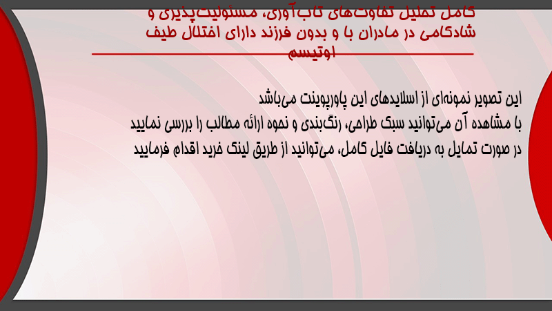 پاورپوینت کامل تحلیل تفاوتهای تابآوری، مسئولیتپذیری و شادکامی در مادران با و بدون فرزند دارای اختلال طیف اوتیسم