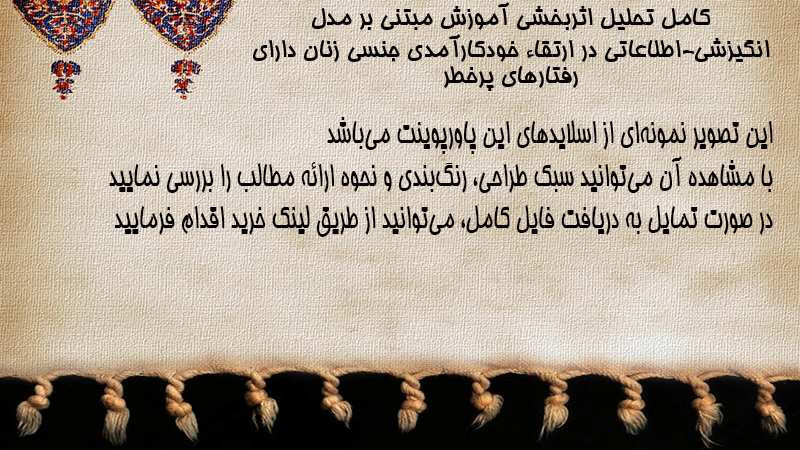 پاورپوینت کامل تحلیل اثربخشی آموزش مبتنی بر مدل انگیزشی-اطلاعاتی در ارتقاء خودکارآمدی جنسی زنان دارای رفتارهای پرخطر