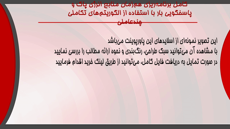 پاورپوینت کامل برنامهریزی همزمان منابع انرژی پاک و پاسخگویی بار با استفاده از الگوریتمهای تکاملی چندعاملی