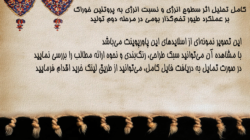 پاورپوینت کامل تحلیل اثر سطوح انرژی و نسبت انرژی به پروتئین خوراک بر عملکرد طیور تخمگذار بومی در مرحله دوم تولید
