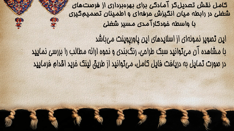 پاورپوینت کامل نقش تعدیلگر آمادگی برای بهرهبرداری از فرصتهای شغلی در رابطه میان انگیزش حرفهای و اطمینان تصمیمگیری با واسطه خودکارآمدی مسیر شغلی