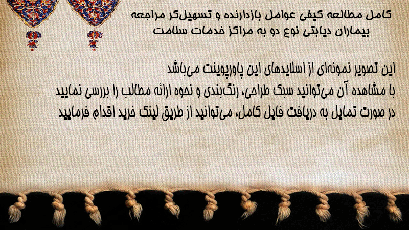 پاورپوینت کامل مطالعه کیفی عوامل بازدارنده و تسهیلگر مراجعه بیماران دیابتی نوع دو به مراکز خدمات سلامت