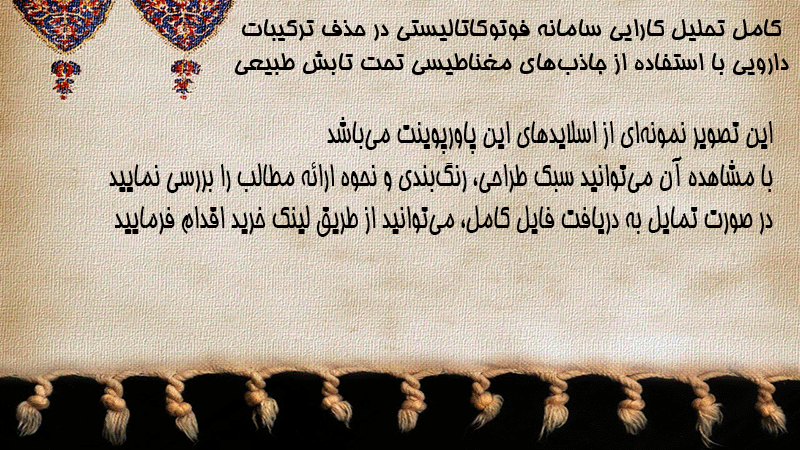 پاورپوینت کامل تحلیل کارایی سامانه فوتوکاتالیستی در حذف ترکیبات دارویی با استفاده از جاذبهای مغناطیسی تحت تابش طبیعی