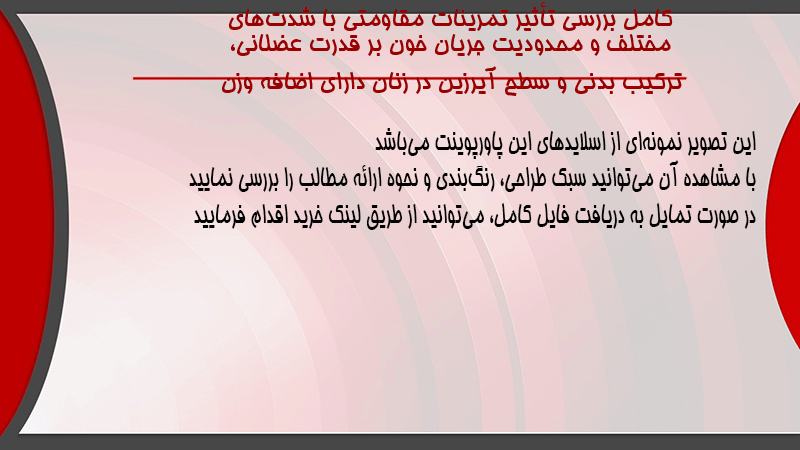 پاورپوینت کامل بررسی تأثیر تمرینات مقاومتی با شدتهای مختلف و محدودیت جریان خون بر قدرت عضلانی، ترکیب بدنی و سطح آیرزین در زنان دارای اضافه وزن