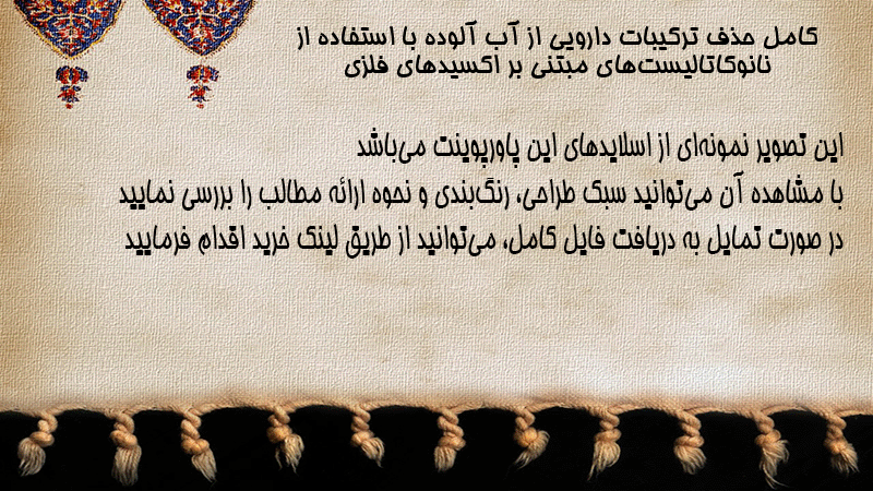 پاورپوینت کامل حذف ترکیبات دارویی از آب آلوده با استفاده از نانوکاتالیستهای مبتنی بر اکسیدهای فلزی