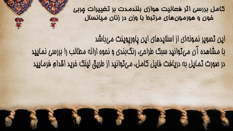پاورپوینت کامل بررسی اثر فعالیت هوازی بلندمدت بر تغییرات چربی خون و هورمونهای مرتبط با وزن در زنان میانسال