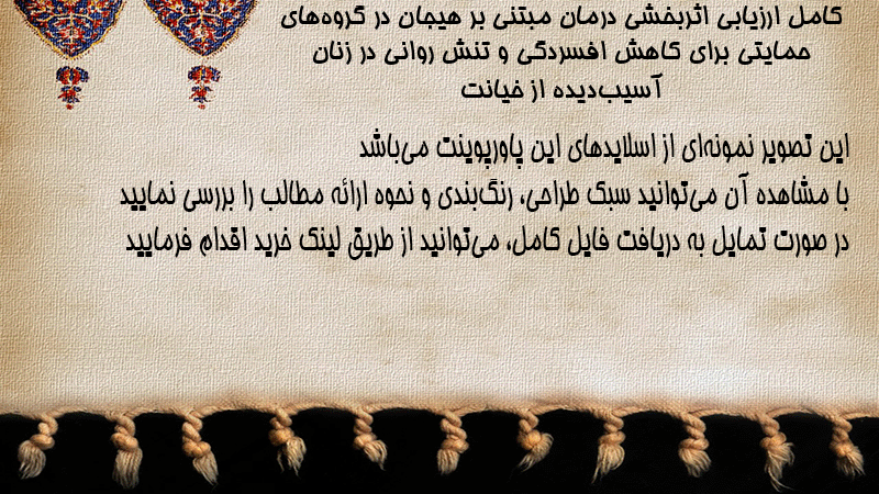 پاورپوینت کامل ارزیابی اثربخشی درمان مبتنی بر هیجان در گروههای حمایتی برای کاهش افسردگی و تنش روانی در زنان آسیبدیده از خیانت