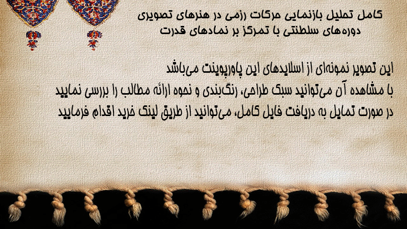 پاورپوینت کامل تحلیل بازنمایی حرکات رزمی در هنرهای تصویری دورههای سلطنتی با تمرکز بر نمادهای قدرت