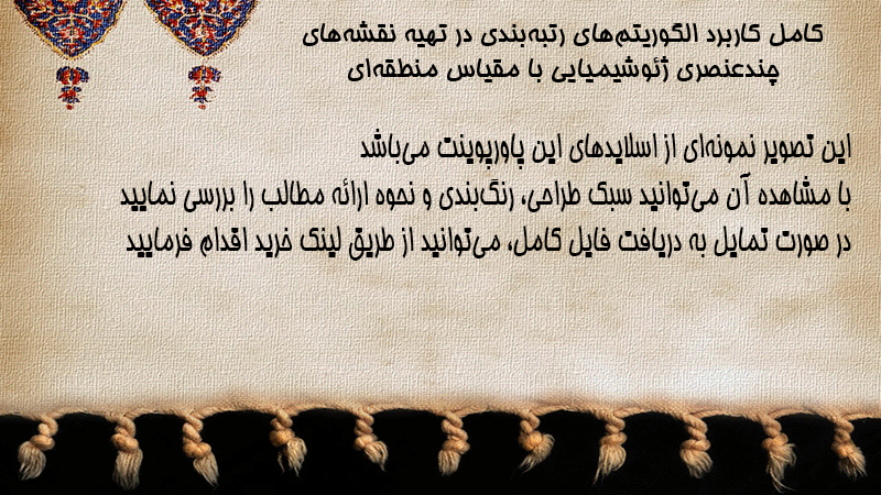 پاورپوینت کامل کاربرد الگوریتمهای رتبهبندی در تهیه نقشههای چندعنصری ژئوشیمیایی با مقیاس منطقهای