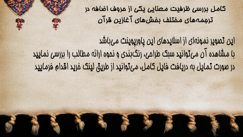 پاورپوینت کامل بررسی ظرفیت معنایی یکی از حروف اضافه در ترجمههای مختلف بخشهای آغازین قرآن