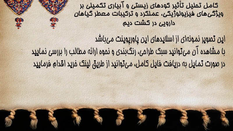 پاورپوینت کامل تحلیل تأثیر کودهای زیستی و آبیاری تکمیلی بر ویژگیهای فیزیولوژیکی، عملکرد و ترکیبات معطر گیاهان دارویی در کشت دیم