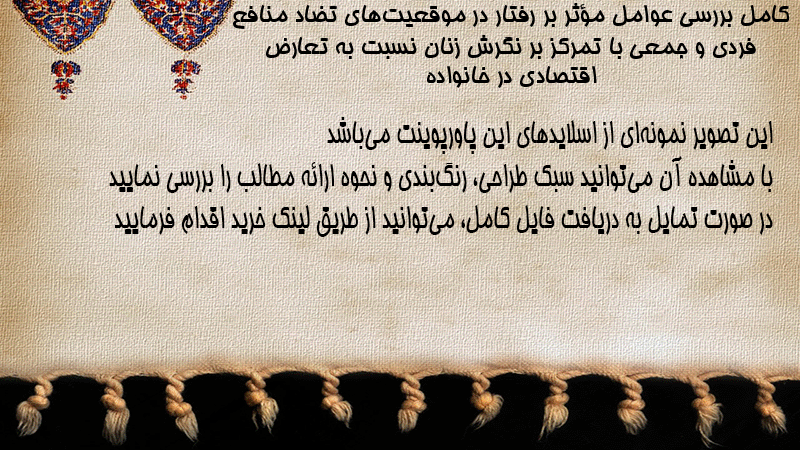 پاورپوینت کامل بررسی عوامل مؤثر بر رفتار در موقعیتهای تضاد منافع فردی و جمعی با تمرکز بر نگرش زنان نسبت به تعارض اقتصادی در خانواده