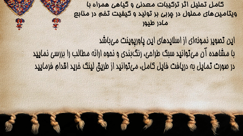 پاورپوینت کامل تحلیل اثر ترکیبات معدنی و گیاهی همراه با ویتامینهای محلول در چربی بر تولید و کیفیت تخم در منابع مادر طیور