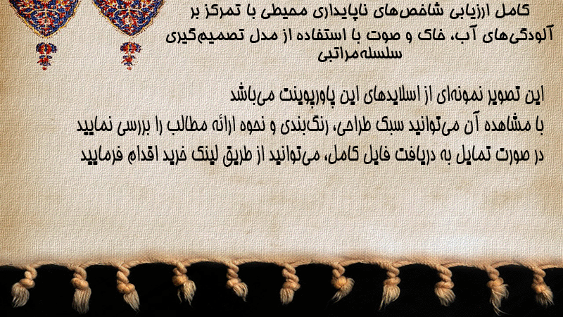 پاورپوینت کامل ارزیابی شاخصهای ناپایداری محیطی با تمرکز بر آلودگیهای آب، خاک و صوت با استفاده از مدل تصمیمگیری سلسلهمراتبی