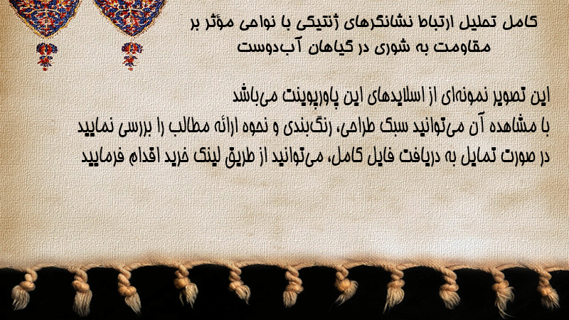 پاورپوینت کامل تحلیل ارتباط نشانگرهای ژنتیکی با نواحی مؤثر بر مقاومت به شوری در گیاهان آبدوست