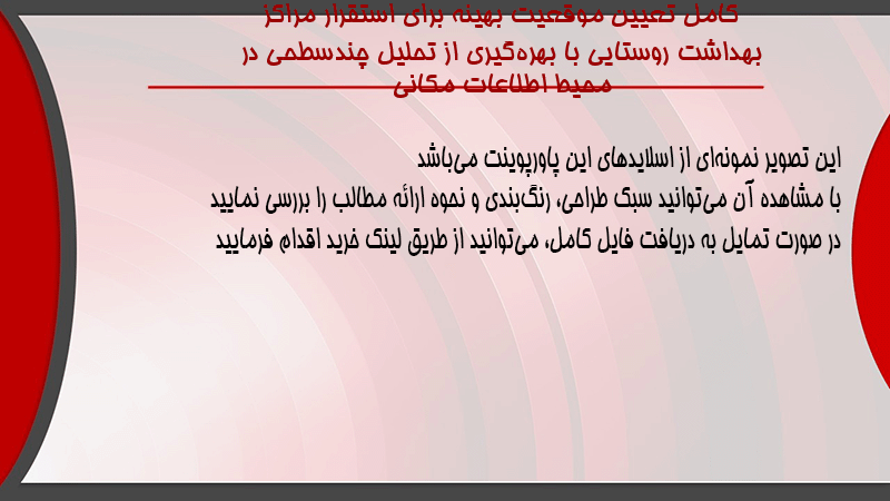 پاورپوینت کامل تعیین موقعیت بهینه برای استقرار مراکز بهداشت روستایی با بهرهگیری از تحلیل چندسطحی در محیط اطلاعات مکانی