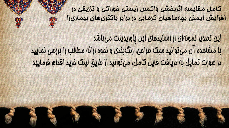 پاورپوینت کامل مقایسه اثربخشی واکسن زیستی خوراکی و تزریقی در افزایش ایمنی بچهماهیان گرمابی در برابر باکتریهای بیماریزا