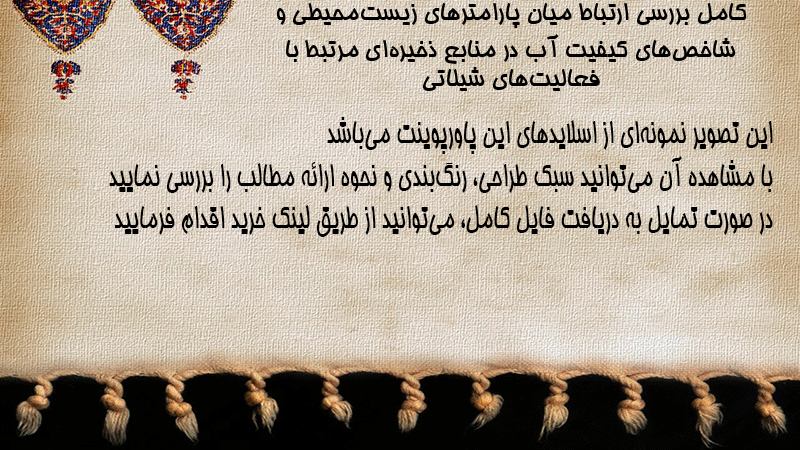 پاورپوینت کامل بررسی ارتباط میان پارامترهای زیستمحیطی و شاخصهای کیفیت آب در منابع ذخیرهای مرتبط با فعالیتهای شیلاتی