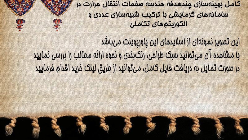 پاورپوینت کامل بهینهسازی چندهدفه هندسه صفحات انتقال حرارت در سامانههای گرمایشی با ترکیب شبیهسازی عددی و الگوریتمهای تکاملی