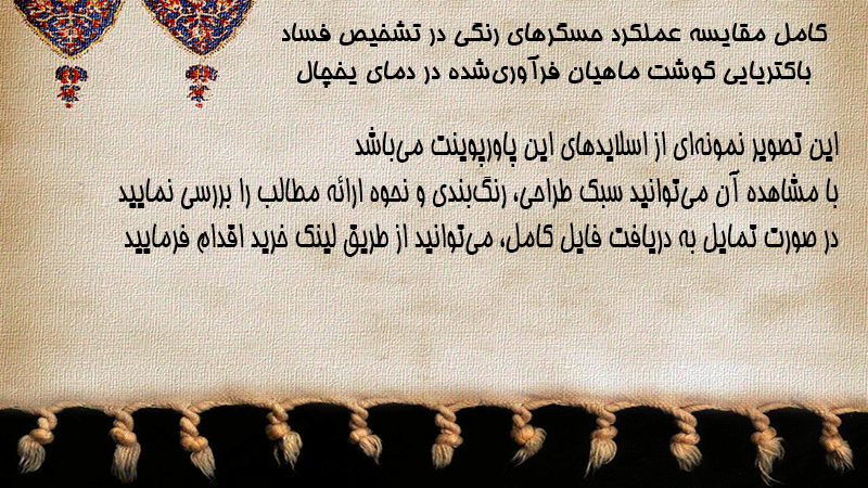 پاورپوینت کامل مقایسه عملکرد حسگرهای رنگی در تشخیص فساد باکتریایی گوشت ماهیان فرآوریشده در دمای یخچال